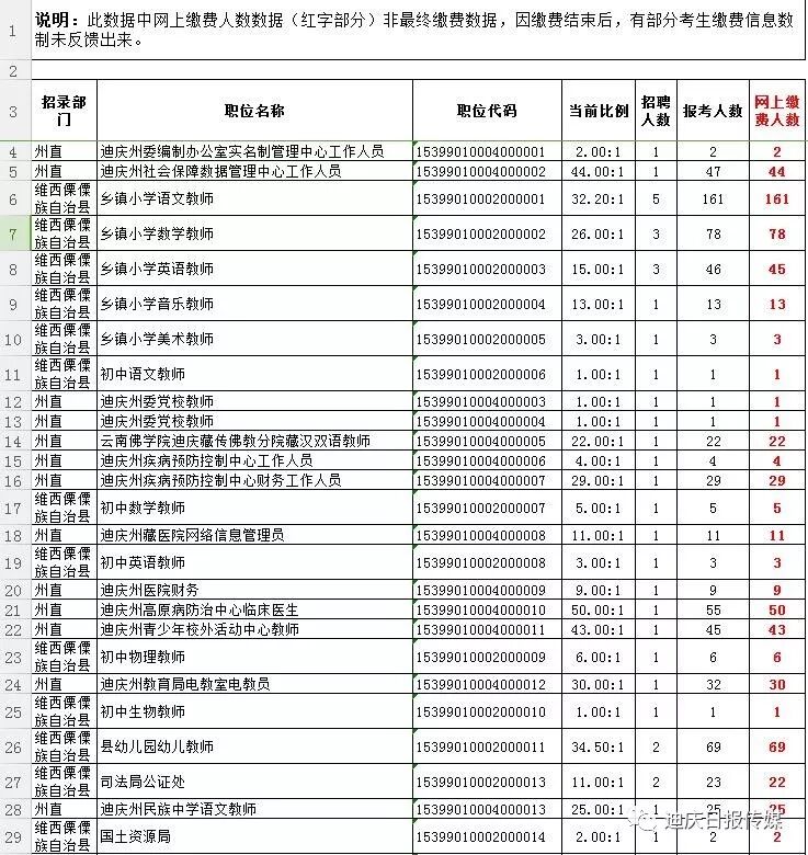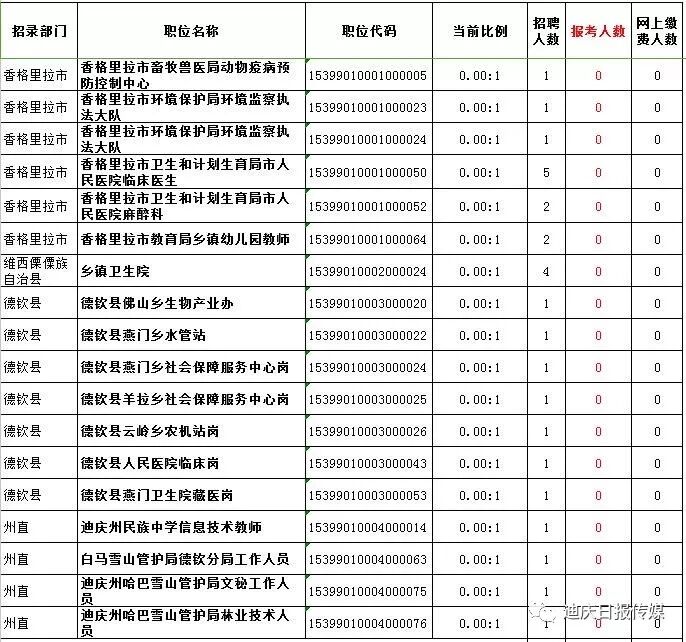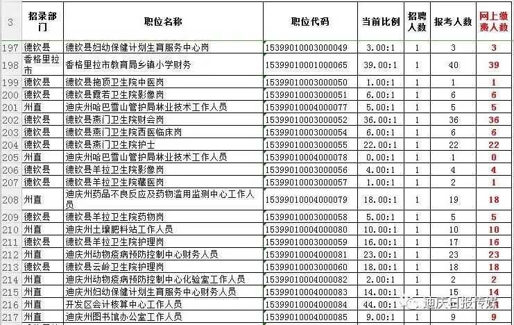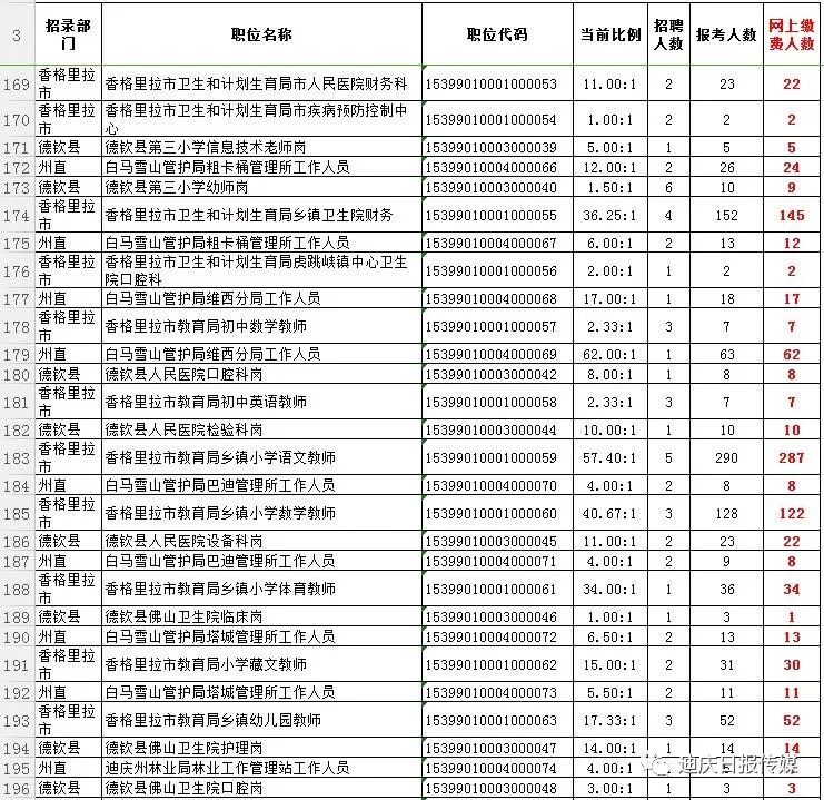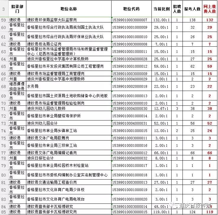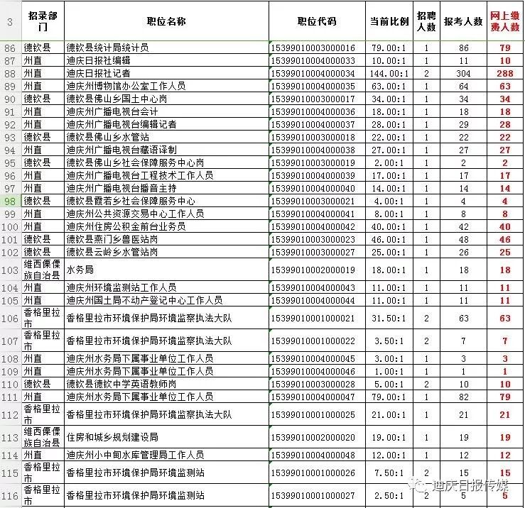 梳理报考统计表格发现,今年的事业单位考试,维西县乡镇政府岗位很“火”,最热岗位竞争比例高达231.5:1,可谓“两百里挑一”。此外,迪庆日报社招录2名记者,共有288人报名、资审、缴费成功,竞争比例为144:1。德钦县环保局监察大队监察岗排名第五,竞争比例为132:1。