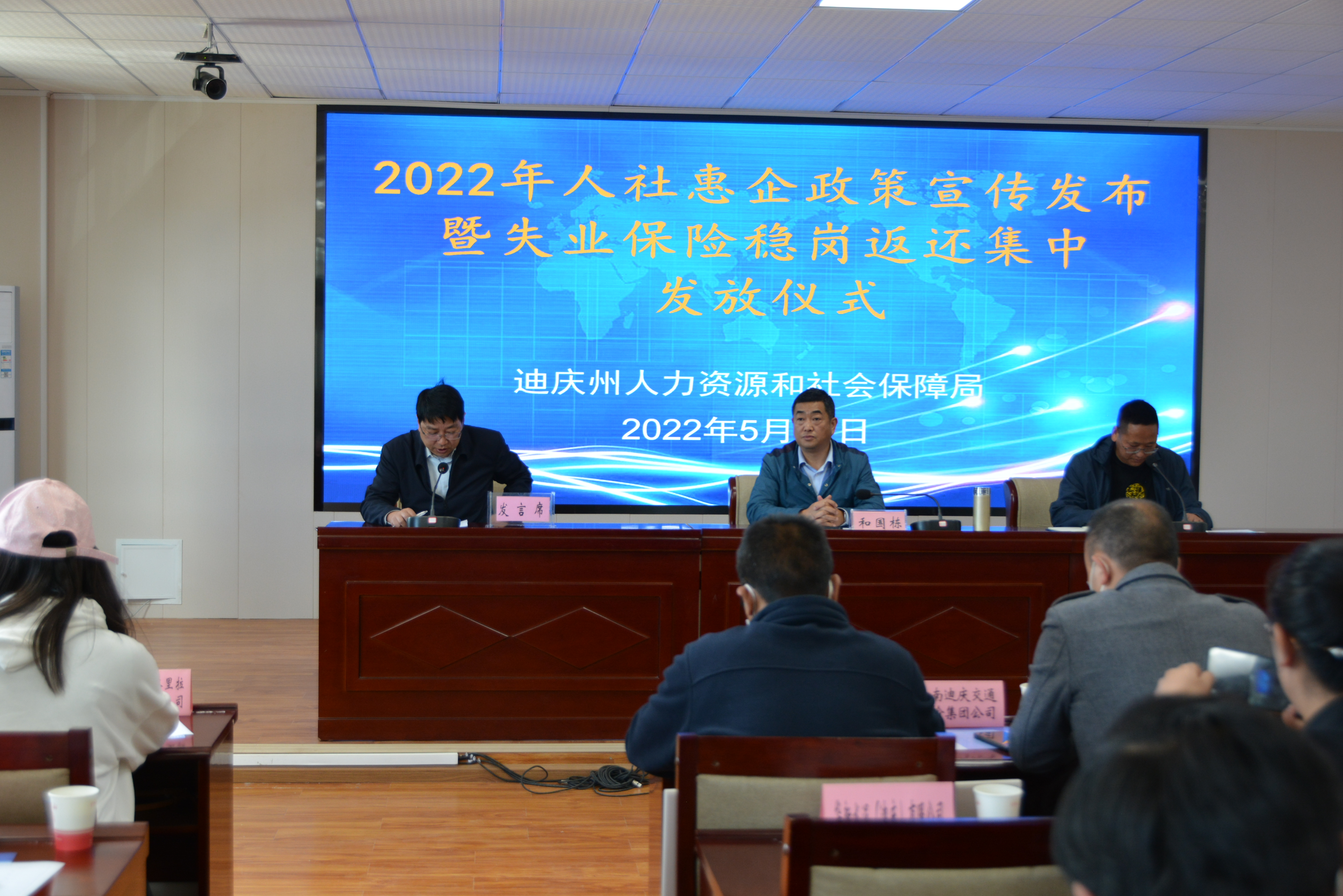 为认真贯彻落实党中央、国务院和省委、省政府关于助企纾困的决策部署,提高人社惠企政策的知晓度,持续推动优化营商环境工作落实,最大限度发挥失业保险稳岗返还稳岗扩就业的政策效应,2022年5月31日,在迪庆州人社局5楼会议室举行人社惠企政策宣传发布暨失业保险稳岗返还集中发放仪式,邀请迪庆州本级70余户代表企业参加。会上,向首批符合条件的125家参保企业集中发放稳岗返还资金339.24万元。州人社局党组成员、就业局局长和国栋出席发放仪式并讲话。