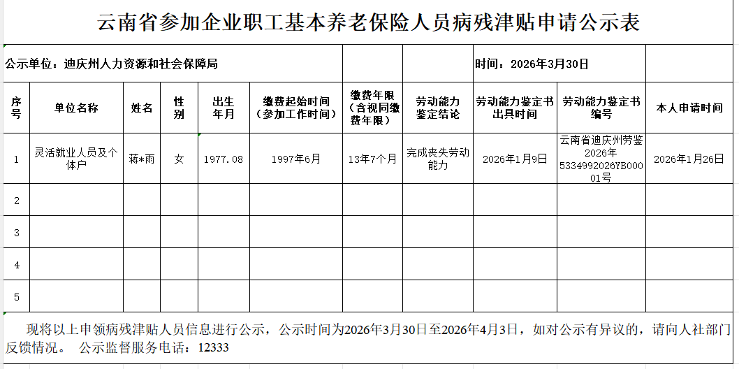 根据《企业职工基本养老保险病残津贴暂行办法》《云南省人力资源和社会保障厅关于做好企业职工基本养老保险病残津贴有关工作的通知》规定,现就我州灵活就业人员申请病残津贴人员信息进行公示,公示时间为2026年3月30日至2026年4月3日,如对公示有异议的,请向迪庆州人力资源和社会保障局反馈情况。