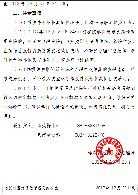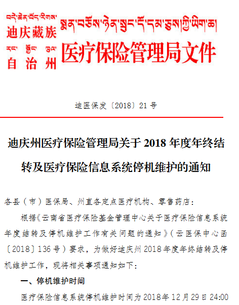 迪庆州医疗保险管理局关于2018 年度年终结转及医疗保险信息系统停机维护的通知