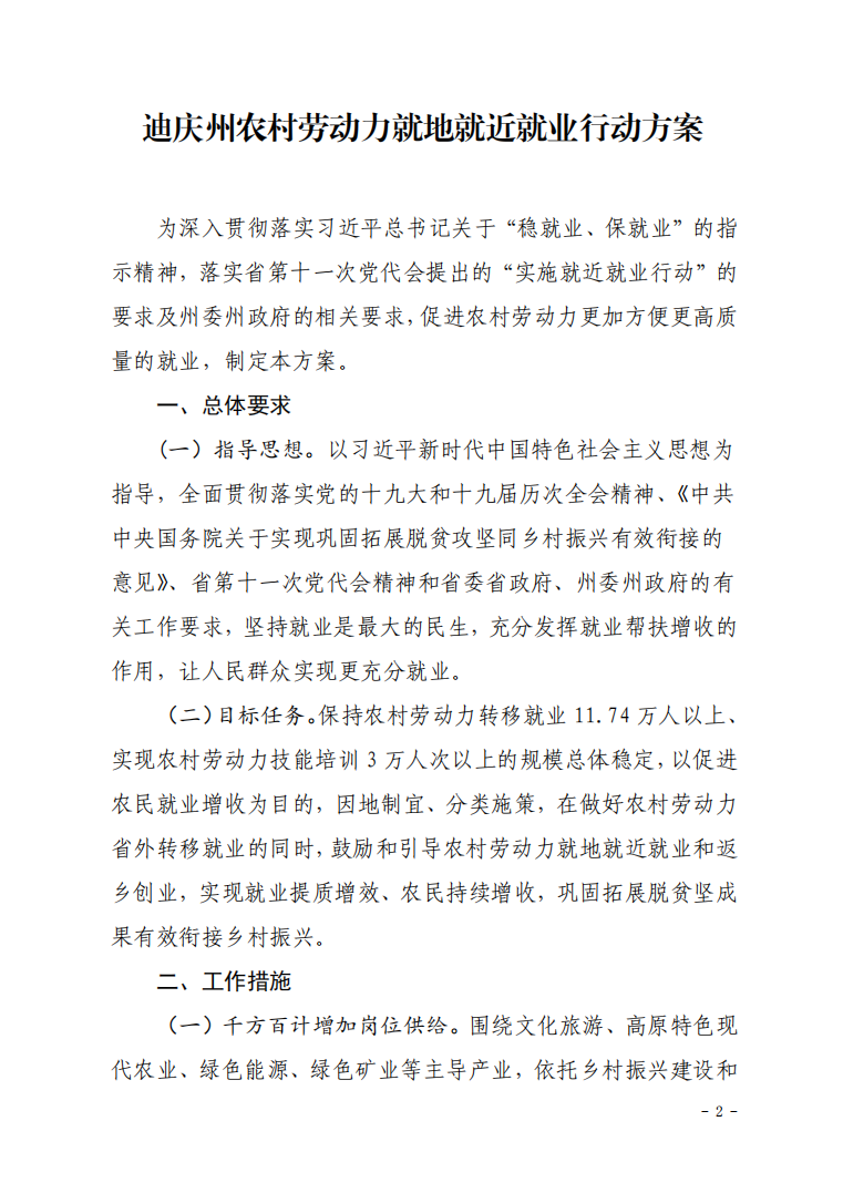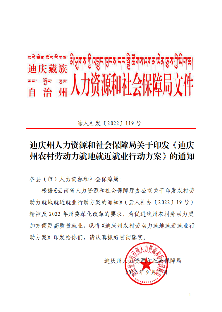 迪庆州人力资源和社会保障局关于印发《迪庆州农村劳动力就地就近就业行动方案》的通知