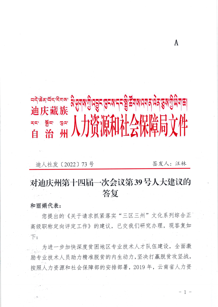 对迪庆州第十四届一次会议第39号人大建议的答复