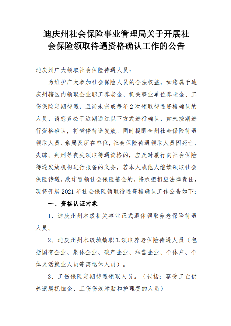 为维护广大参加社会保险人员的合法权益,如您属于迪庆州辖区内领取企业职工养老金、机关事业单位养老金、工伤保险定期待遇,且尚未完成每年2次领取待遇资格确认的人员,请您务必于近期通过以下方式进行确认,如未按期进行资格确认,将暂停待遇发放。同时提醒全州社会保险待遇领取人员、亲属及所在单位,社会保险待遇领取人员因死亡、失踪、判刑等丧失领取待遇资格的,应及时履行向社会保险待遇发放机构进行报备的义务,若本人或他人继续领取社会保险待遇,欺诈冒领社会保险基金的,将承担相应法律责任。现将开展2021年社会保险领取待遇资格确认工作公告如下: