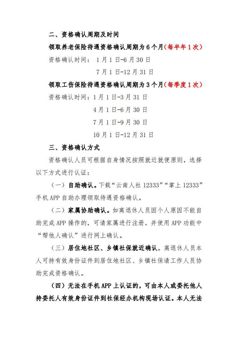 自助确认。下载“云南人社12333”“掌上12333”手机APP自助办理领取待遇资格确认。