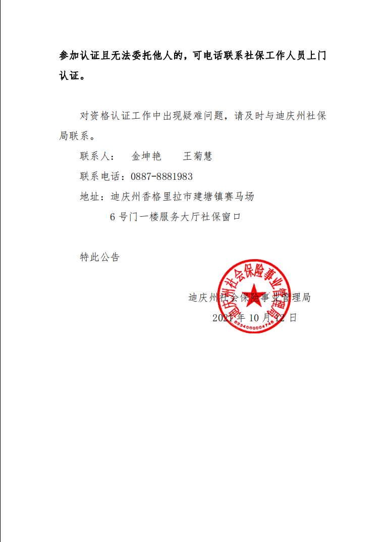 对资格认证工作中出现疑难问题,请及时与迪庆州社保局联系。