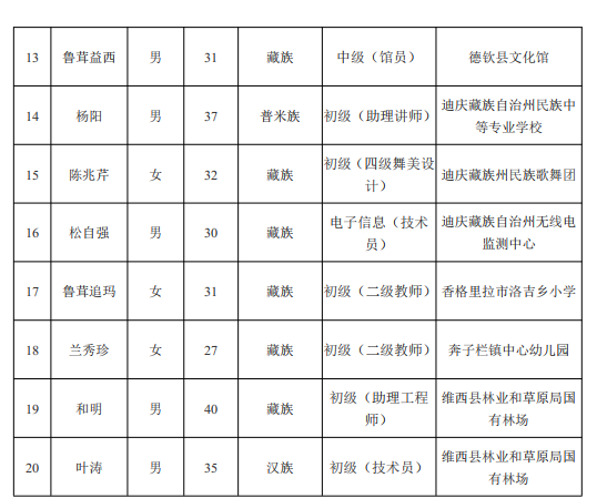 根据云南省人力资源和社会保障厅关于印发《云南省涉藏州县少数民族专业技术人才特殊培养选拔管理办法》的通知(云人社通〔2022〕11号)和云南省人力资源和社会保障厅《关于开展2023年度云南省少数民族专业技术人特殊培养工作的通知》文件精神,迪庆州人力资源和社会保障局坚持公开、公平、公正原则,坚持紧贴岗位需要和培养使用相结合的原则,严格按照个人申报、行业主管部门推荐、组织专家评议审定的程序开展选拔工作,现根据选拔程序将我州符合选拔条件参加培养的刘晓君等20位专业技术人选予以公示。公示期5个工作日(2023年4月10日-2023年4月14日)。如有异议,可向迪庆州人力资源和社会保障局事业单位人事管理科反映,电话:0887-8222605。